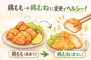 「鶏もも肉から鶏むね肉に変えてみる」など。